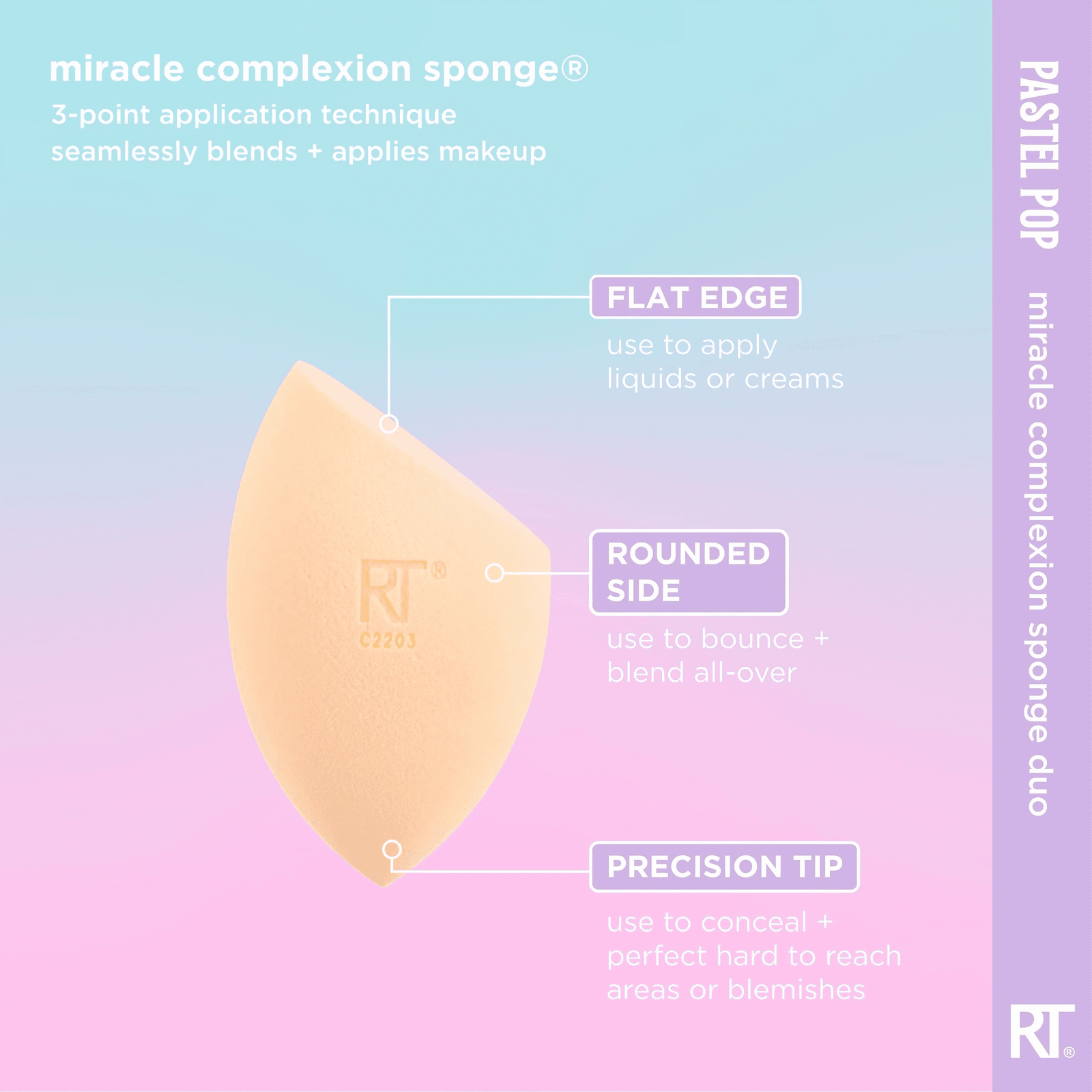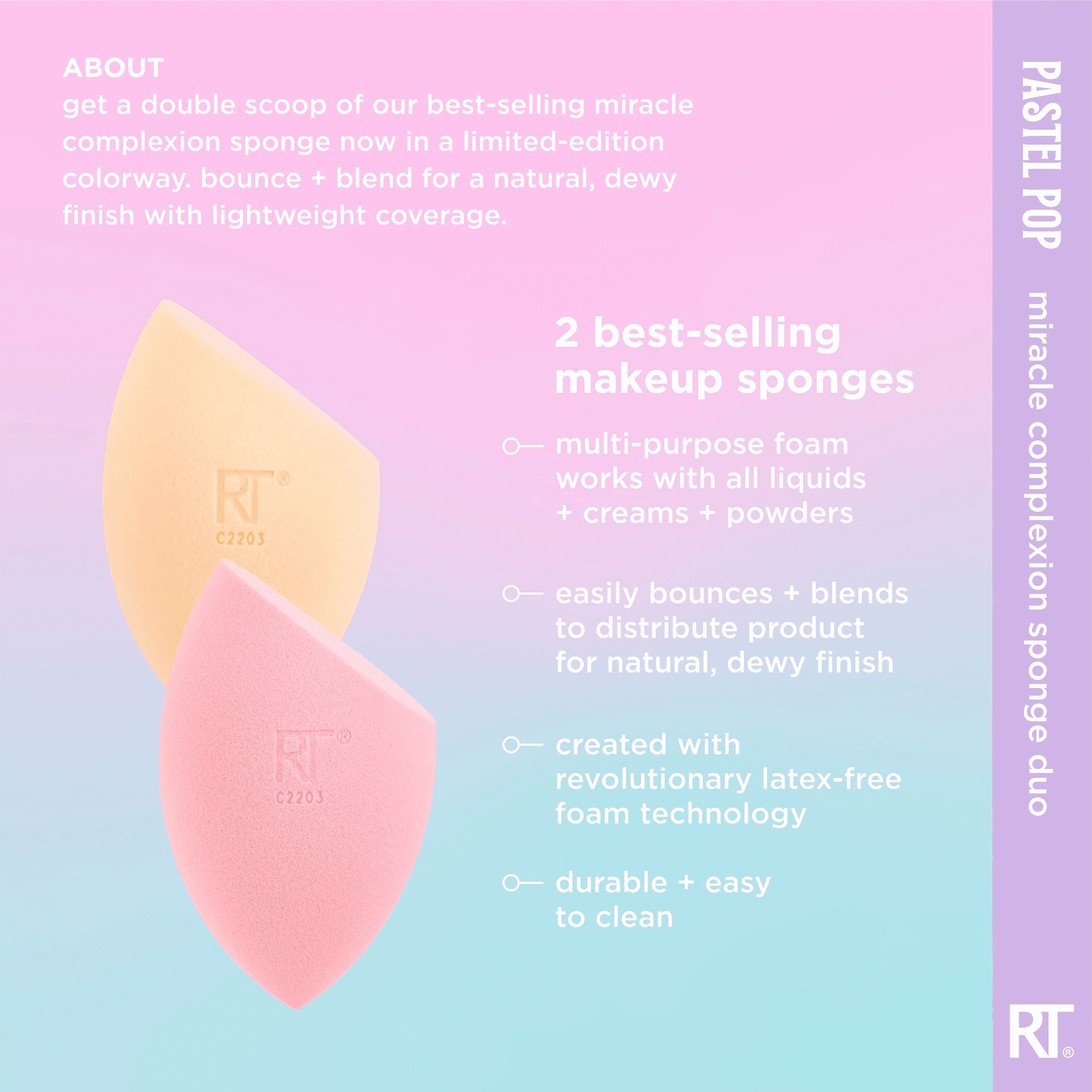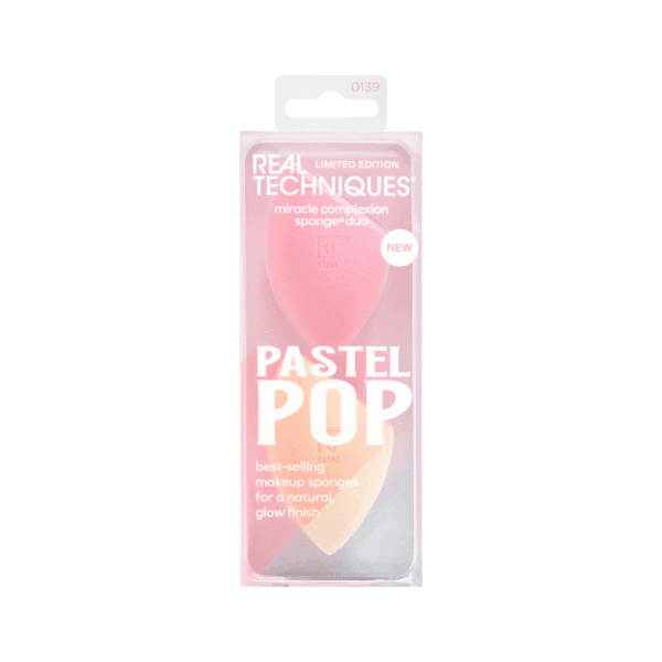 Спонж для макіяжу Real Techniques Pastel Pop Miracle Complexion Makeup Sponge Duo пропонує вам 2 ваші улюблені спонжі для розтушовування макіяжу в лімітованому кольорі для бездоганно розтушованої основи. Ці спонжі для макіяжу забезпечують природний, ніжний фініш, використовуючи рідкі та кремові засоби для макіяжу, такі як тональний крем